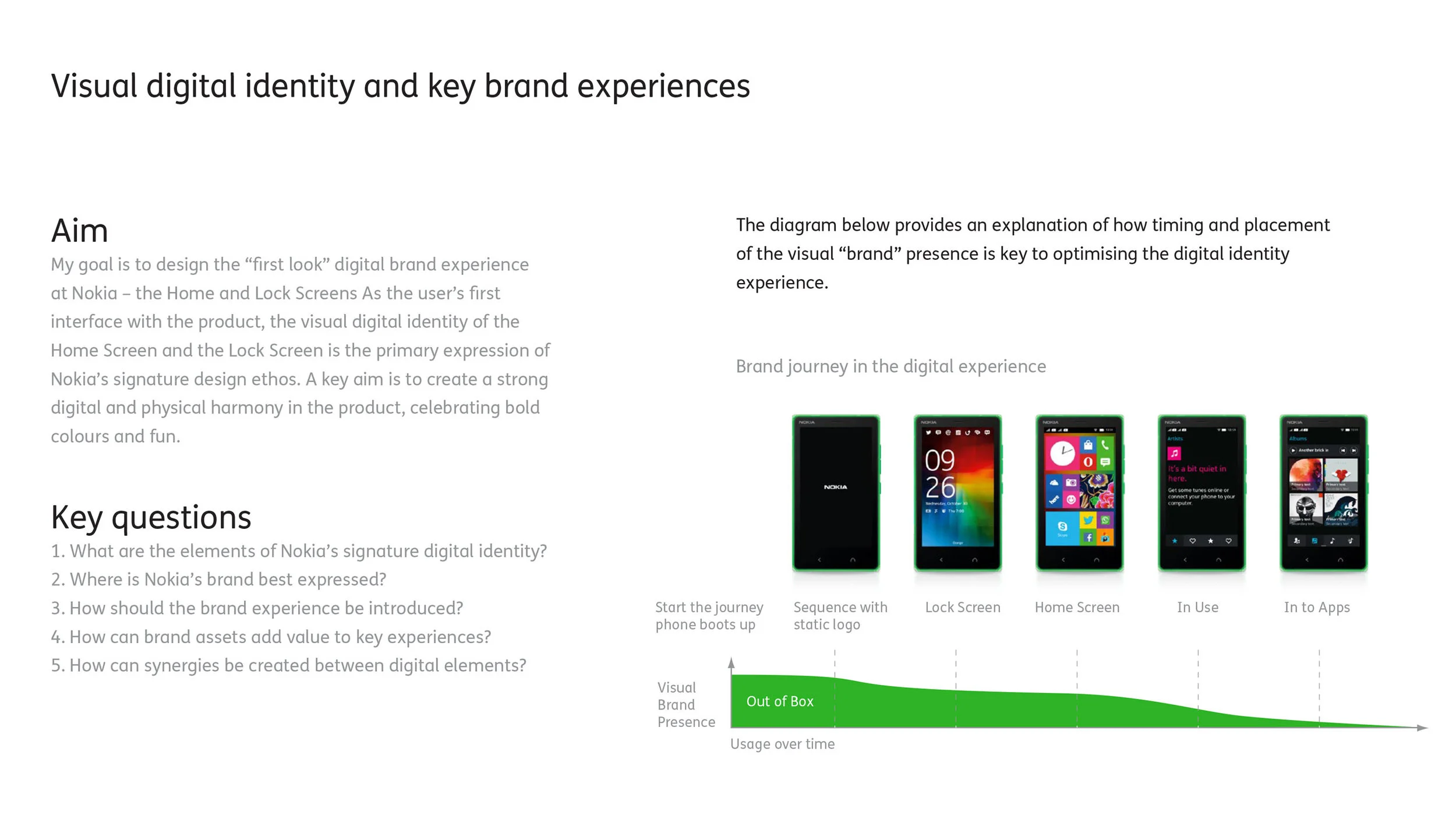 By combining consumer and societal trend analysis between the user and the device, I worked to focus the Nokia digital identity on aspects of visual and functional product design.